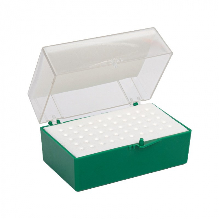 Cutie cu capac detașabil, special concepută pentru păstrarea capetelor de freză. Este confecționată din plastic transparent și rezistent, are o capacitate de 50 capete de freze, fiecare având câte un orificiu separat de păstrare, ceea ce ajută la găsirea rapidă a frezei dorite.Dimensiune: 9 X 5,3 cm.