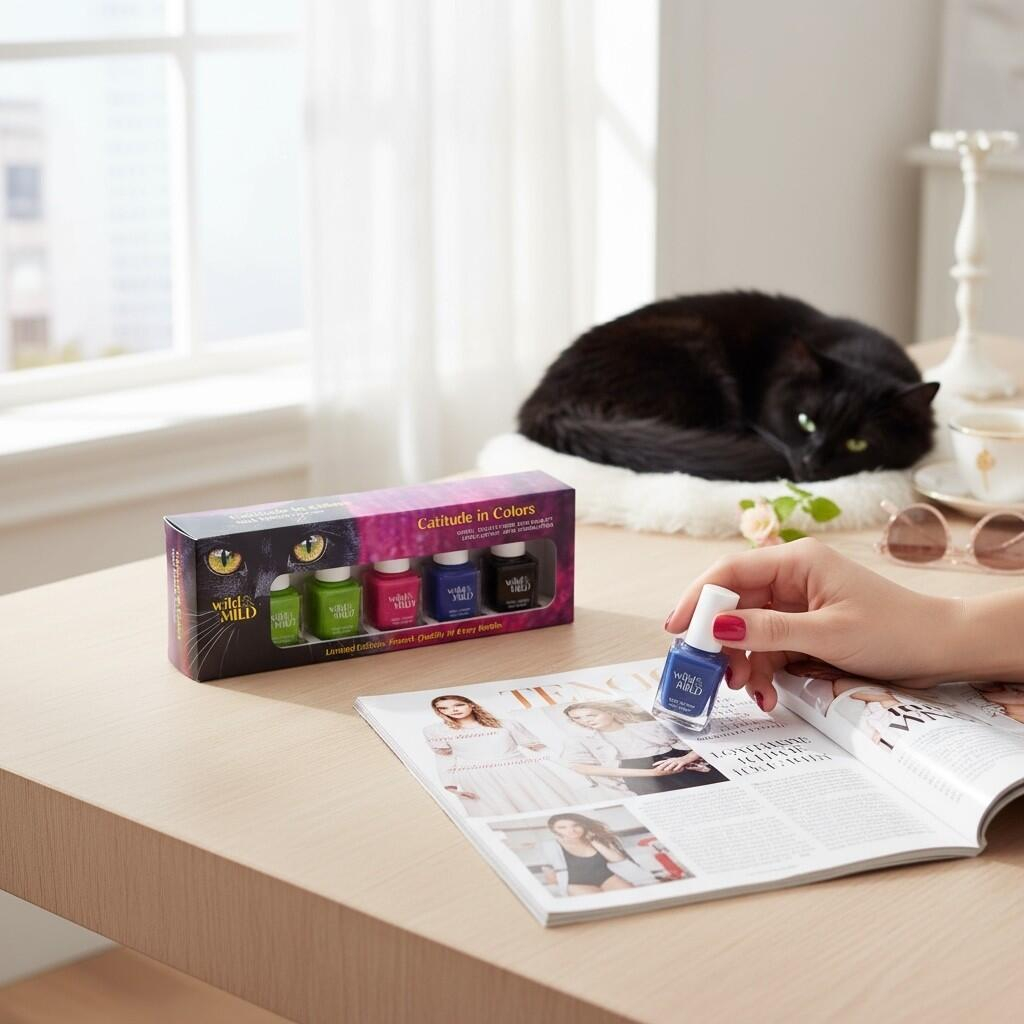 Cinci nuanțe fermecătoare, la granița dintre mister și rafinament, adunate într-un set care celebrează personalitatea jucăușă, elegantă și puternică a pisicilor. Fiecare culoare spune o poveste nocturnă: