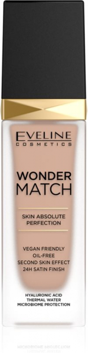 Fondul de ten Eveline Cosmetics Wonder Match uniformizează nuanța pielii, acoperind micile imperfecțiuni. Formula îmbogățită cu apă termală și acid hialuronic hrănește, hidratează și protejează microbiomul pielii. După doar 10 zile, pielea este netedă și mai elastică.