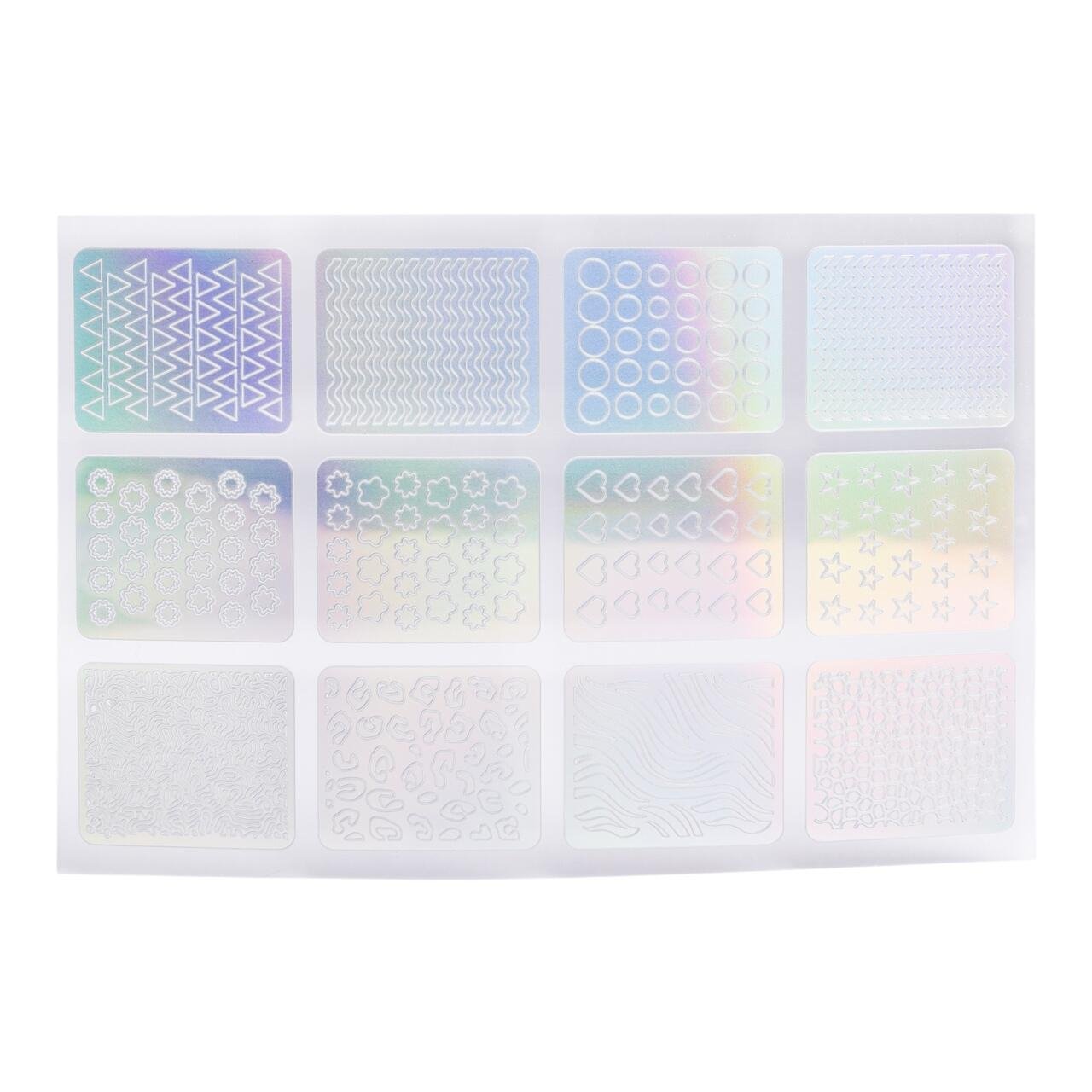 • 1 set de șabloane holografice pentru unghii, cu 12 modele diferite(inimioare, stele, flori, linii, forme geometrice, valuri etc.)