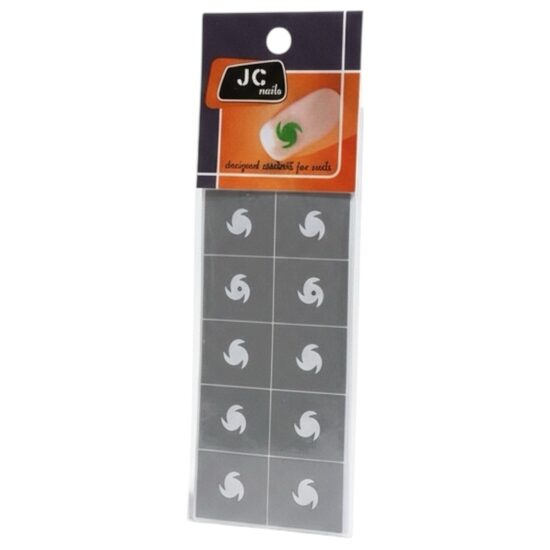 - Dezlipiti de pe hartie una dintre foliile sablon, atingeti de cateva ori cu buricul degetului fata adeziva a acesteia pentru a dezactiva usor adezivul. In acest fel sablonul nu va lasa urme pe stratul de oja de baza.