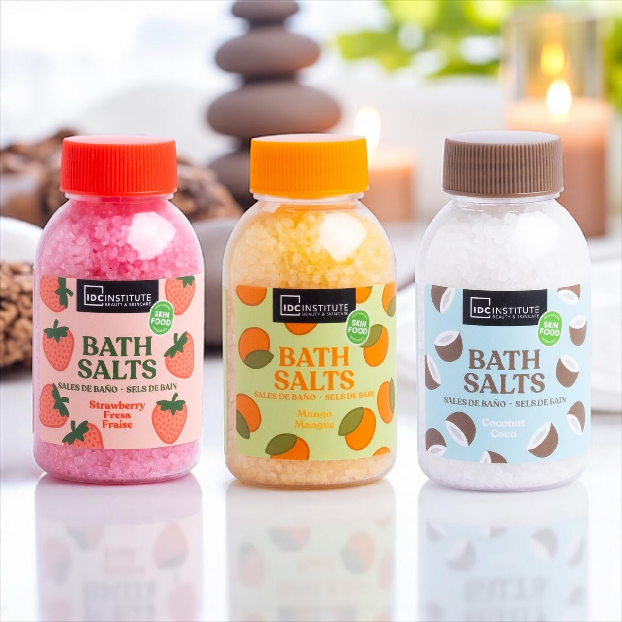 Transformă fiecare baie într-un moment de relaxare deplină cu sărurile de baie IDC Institute – Skin Food Collection. Concepute pentru a oferi o experiență senzorială rafinată, aceste săruri se dizolvă ușor în apă, eliberând arome delicioase de căpșună, cocos și mango, care îmbrățișează pielea și simțurile într-o stare de calm și bunăstare.