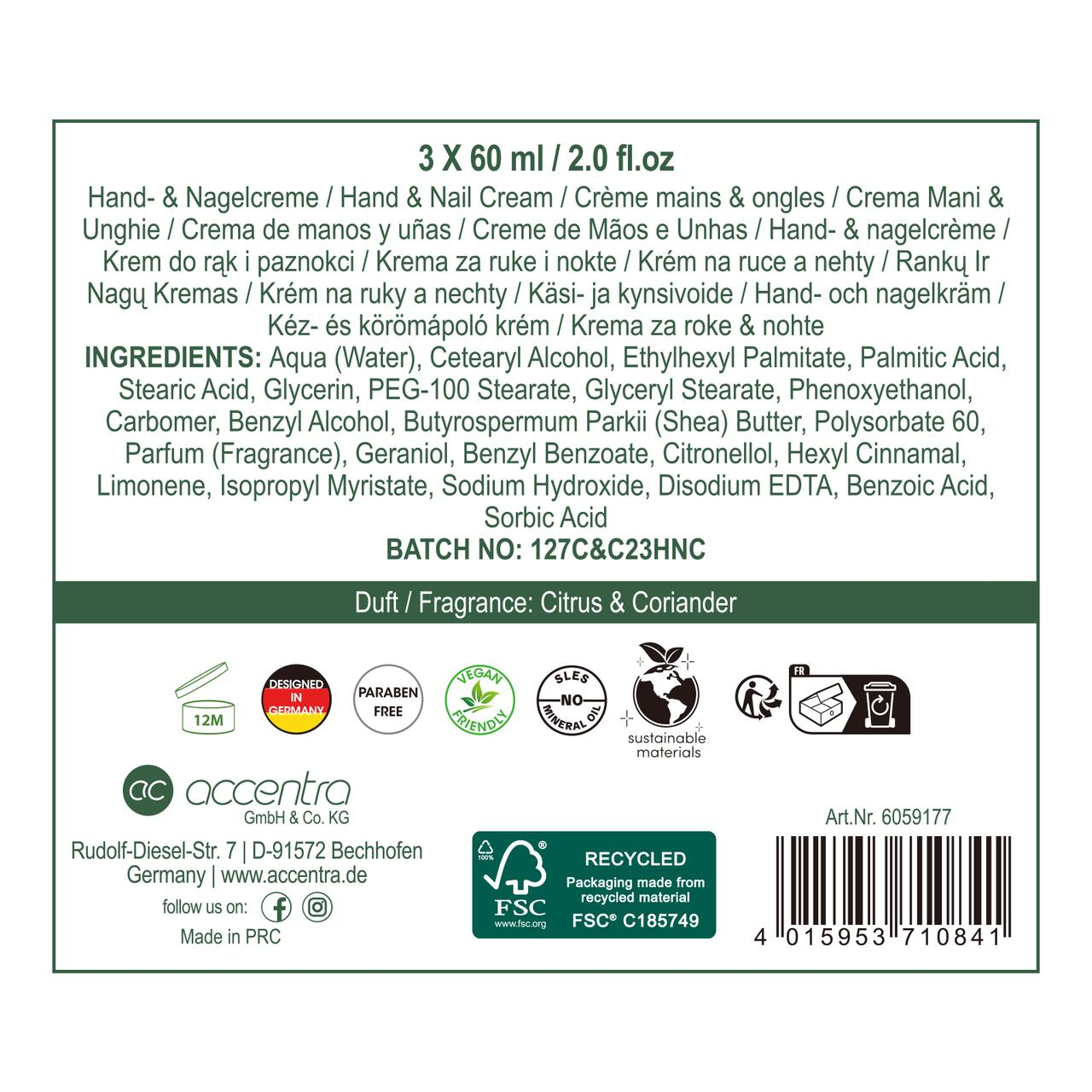 Setul Accentra Herbal Spa Citrus & Coriander oferă un ritual complet de îngrijire a mâinilor, inspirat din prospețimea naturii. Cele trei creme pentru mâini și unghii au o textură catifelată, se absorb rapid și ajută la hidratarea pielii, lăsând mâinile fine și plăcut parfumate.