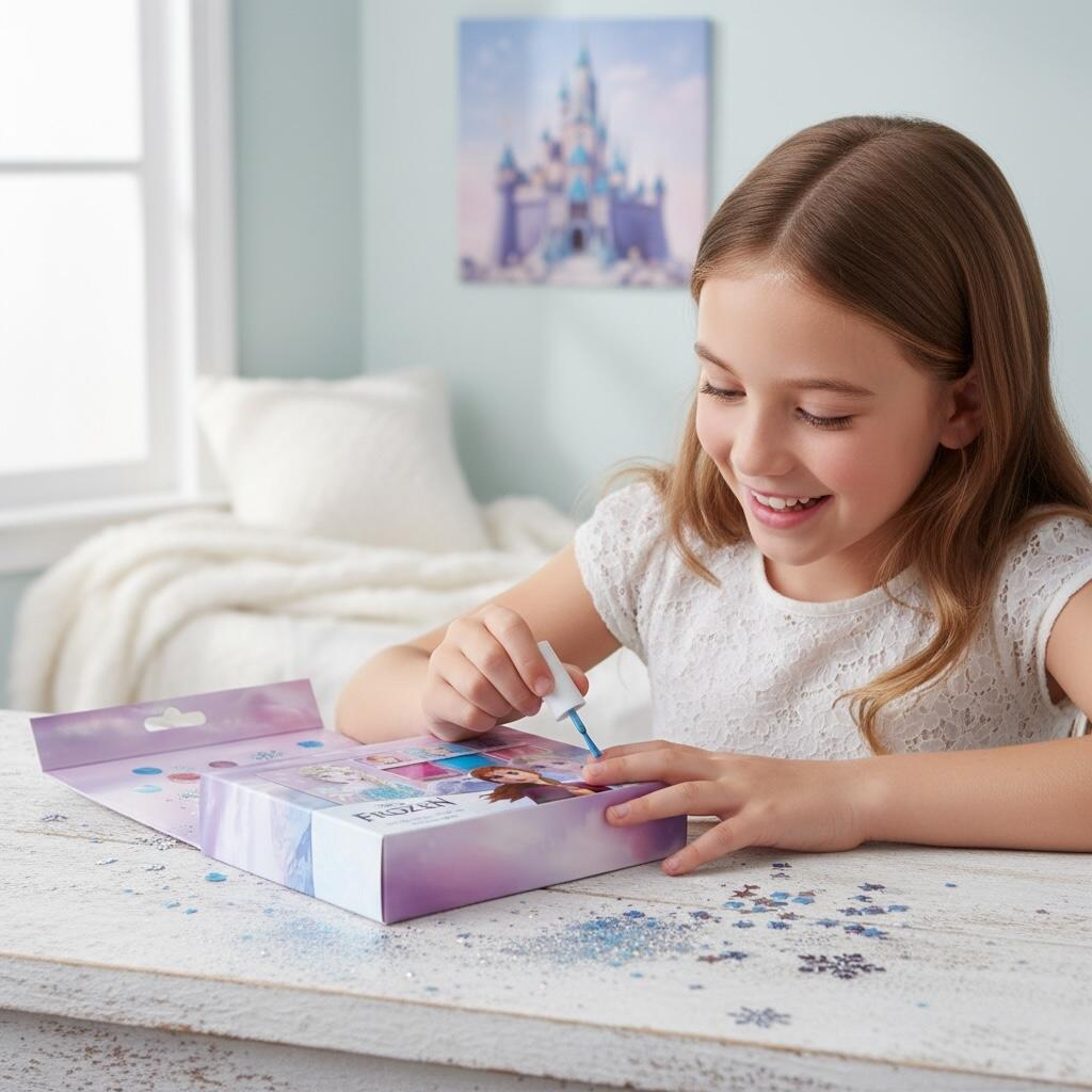 Culorile pastelate și strălucitoare – mov, roz și bleu – completează perfect universul Frozen și fac din acest set un cadou minunat pentru orice ocazie.