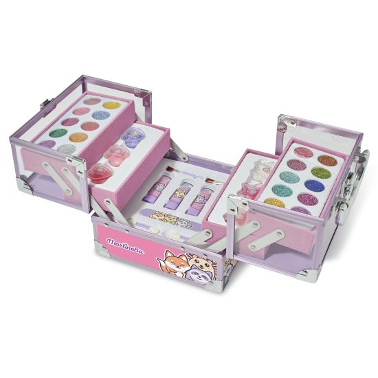 O lume plina de culoare si sclipire cu setul de frumusete My Best Friends Big Makeup Case de la Martinelia – cutie de machiaj pentru copii cu trei niveluri, cu detalii argintii, ce include 6 luciu de buze, 20 de farduri de pleoape cu sclipici in forma compacta, 4 rujuri, 2 pensule, 2 bureti de machiaj, 1 pila si o oglinda. Produs testat dermatologic. Dimensiuni produs: 17 x 17,5 x 20 cm Avertismente: Uz extern. Produsul nu este recomandat copiilor sub 3 ani.A se folosi sub supravegherea unui adult.Evitati contactul cu ochii. In cazul contactului cu ochii clatiti cu apa din abundenta. Depozitati in mediu uscat, ferit de lumina soarelui, la temperaturi intre 18-25 grade C, cu capacul inchis cu grija.