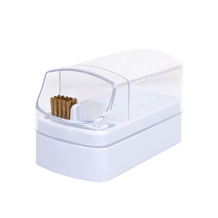Cutie cu capac detașabil, special concepută pentru păstrarea capetelor de freză. Este confecționată din plastic transparent și rezistent, are o capacitate de 30 capete de freze, fiecare având câte un orificiu separat de păstrare, ceea ce ajută la găsirea rapidă a frezei dorite.Dimensiune: 10,5 X 6 cm. Contine si o perie pentru curatat capete de freza (o parte din alama si cealalta din par sintetic ). Peria are o baza adeziva, astfel incat poate fi lipita pe lateralul mesei de manichiura sau chiar pe masa.Dimensiuni: 4,5 X 2,3 cm.