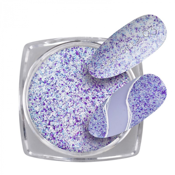 Sugar Glitter Mix este o pulbere strălucitoare special creată pentru decorarea unghiilor false. Este asemenea cristalelor de zahăr, care poate fi folosită atât pe toată suprafața unghiilor, cât și pentru a crea diferite modele.În funcție de nuanța de bază aleasă își va schimba culoarea.Are un efect strălucitor la lumina zilei, în timp ce în amurg sau întuneric, lumina care cade asupra sa se reflectă.Pulverizați pudra pe suprafața unghiei finisate, într-un strat de luciu care nu se fixează (Crystal Top Coat, Top II Odorless, Master Shine top, Master Cool Top, Master Cool Top Black), apoi polimerizați și îndepărtați surplusul. După polimerizare suprafața unghiei rămâne zgrunțuroasă.