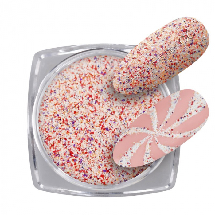 Sugar Glitter Mix este o pulbere strălucitoare special creată pentru decorarea unghiilor false. Este asemenea cristalelor de zahăr, care poate fi folosită atât pe toată suprafața unghiilor, cât și pentru a crea diferite modele.În funcție de nuanța de bază aleasă își va schimba culoarea.Are un efect strălucitor la lumina zilei, în timp ce în amurg sau întuneric, lumina care cade asupra sa se reflectă.Pulverizați pudra pe suprafața unghiei finisate, într-un strat de luciu care nu se fixează (Crystal Top Coat, Top II Odorless, Master Shine top, Master Cool Top, Master Cool Top Black), apoi polimerizați și îndepărtați surplusul. După polimerizare suprafața unghiei rămâne zgrunțuroasă.