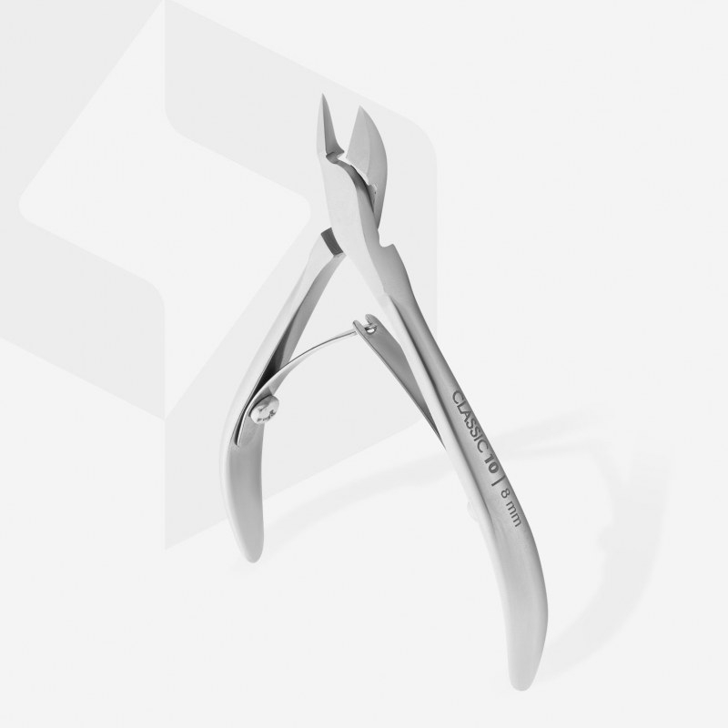 CARACTERISTICI PRINCIPALEClește pentru pieliță, cuticulă.Lungimea lamei: 8 mm.Formă convenabilă a părții de lucru, cu un mic proeminent, „toc”.Tăiere precisă și îngrijită datorită marginilor ascuțite manual.Mânere ergonomice confortabile.Arc dublu durabil, care asigură o mișcare lină a instrumentului.Rezistență suplimentară la coroziune datorită lustruirii cu pastă GOI.Oțel inoxidabil.Poate fi dezinfectat cu un agent special.Proiectat pentru manichiură și pedichiură.Recomandat pentru îngrijirea la domiciliu.Calitatea produselor Staleks este garantată de experiența a peste 20 de ani a companiei producătoare cât și de prezența acesteia în peste 25 de țări.