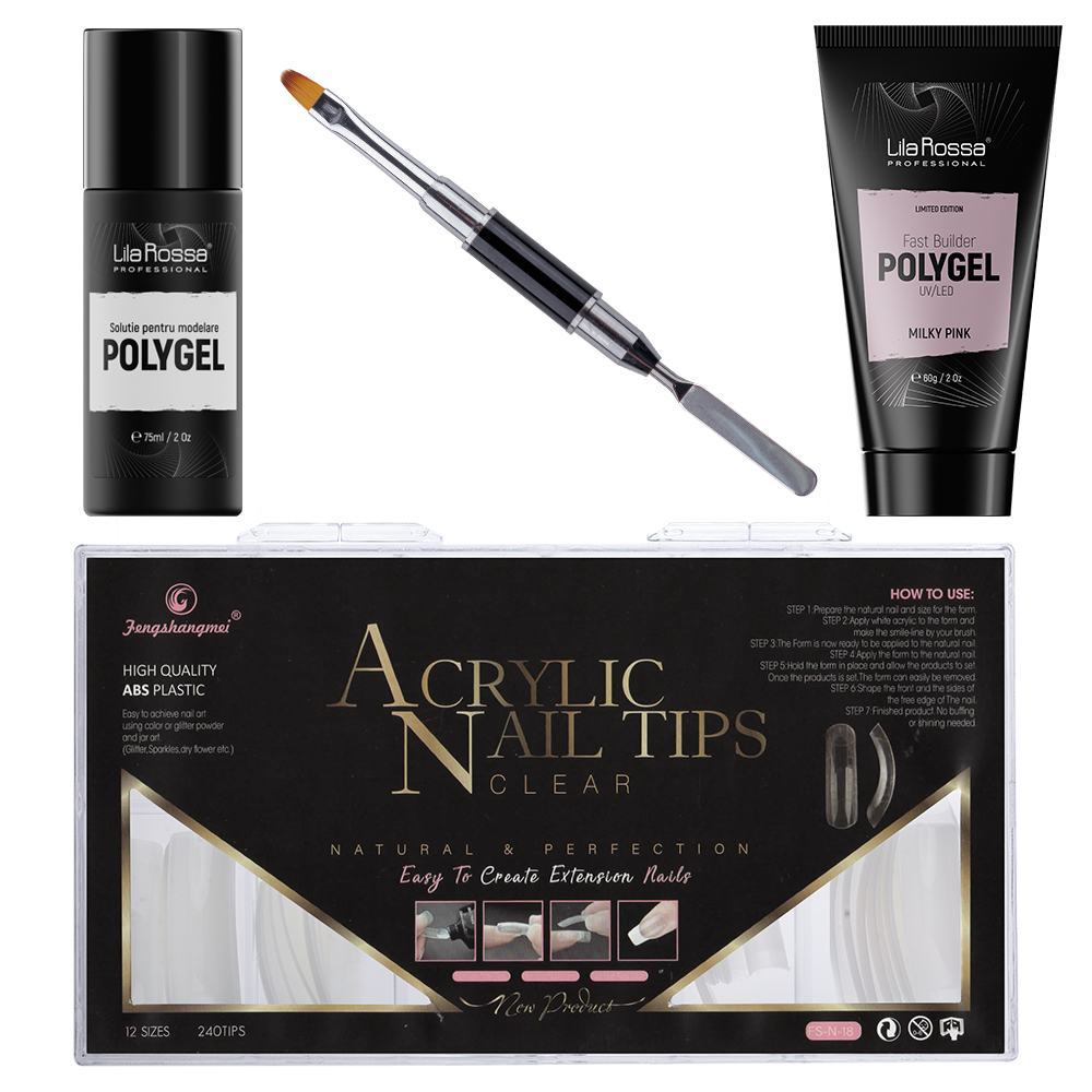 Kit Polygel Premium Milky Pink Lila Rossa pensula tipsuri lichid modelare Fast Builder Polygel 60g Descopera kit-ul complet de manichiura cu polygel! Setul include toate produsele de care ai nevoie pentru realizarea unei manichiuri perfecte cu polygel. Este potrivit pentru uzul personal dar si pentru saloanele de infrumusetare fiind usor de utilizat atat de incepatoare cat si de tehniciene profesioniste.Fast Builder Polygel by Lila Rossa nuanta Milky Pink 60g este gelul acrililc pe care l-ai visat dintotdeauna. Cu o formula revolutionara este foarte rezistent si ideal pentru constructia unghiilor pe tips sau pe sablon. Uscare in lampa UV 2 minute lampa LED 30-60 de secunde.Pensula pentru polygel cu spatula Pensula pentru polygel cu spatula este conceputa special pentru modelarea gelului solid. Aceasta pensula este alcatuita din doua capete. Un capat care permite precizia in intinderea produsului iar celalalt capat este reprezentat de o spatula realizat din otel inoxidabil recomandat pentru: Acryl Gel Poly Gel sau One Step Gel. Fiecare capat are un capac special astfel incat pensula este foarte usor de pastrat si transportat.Tipsuri pentru polygel 240 bucTipsuri reutilizabile din plastic sunt realizate special pentru constructia (extensia) unghiilor naturale cu Poly Gel. Usureaza munca si reduce timpul de lucru. Solutie aplicare polygel este lichidul care ajuta la modelarea polygelului.Mod de folosire: - Spalati mainile cu apa si sapunapoi cu un instrument special impingeti usor cuticula si taiati excesul de cuticula cu forfecuta. - Indepartati suprafata lucioasa a unghiei naturale cu o pila de granulatie 180 - Curatati bine unghia praful ramas in urma pilirii si aplicati lichidele de pregatire: - Pentru pregatirea optima a unghiei naturale si pentru o aderenta mai buna a materialului tehnic se recomanda folosirea urmatoarelor lichide de pregatirea:- Primer – Dehidrateaza suprafata placii unghiale indepartand moleculele de apauscati a aer 60 de secunde.- Aplicati un strat subtire de Polybase polimerizati 60/120 de secunde in lampa LED/UV. - Cu ajutorul spatulei luati o bula de gel si asezati-o pe sablon sau in tipsul reutilizabil pentru a face extensia. - Inmuitai pensula in lichidul special pentru modelare indepartati excesul de lichid pe un servetel uscat. - Modelati Polygelul pe sablon sau in interiorul tipsului special in forma si lungimea dorita.Umeziti pensula de cate ori este nevoie. Polimerizati 60/120 de secunde in lampa LED/UV. - Indepartati sablonul sau tipsul si finisati extensia la lungimea si forma dorita. - Pentru culoarea manichiurii puteti opta pentru orice tip de oja semipermanenta sau gel colorsau puteti pastra culoarea initia a polygelului. - Sigilati manichiura cu top coat.